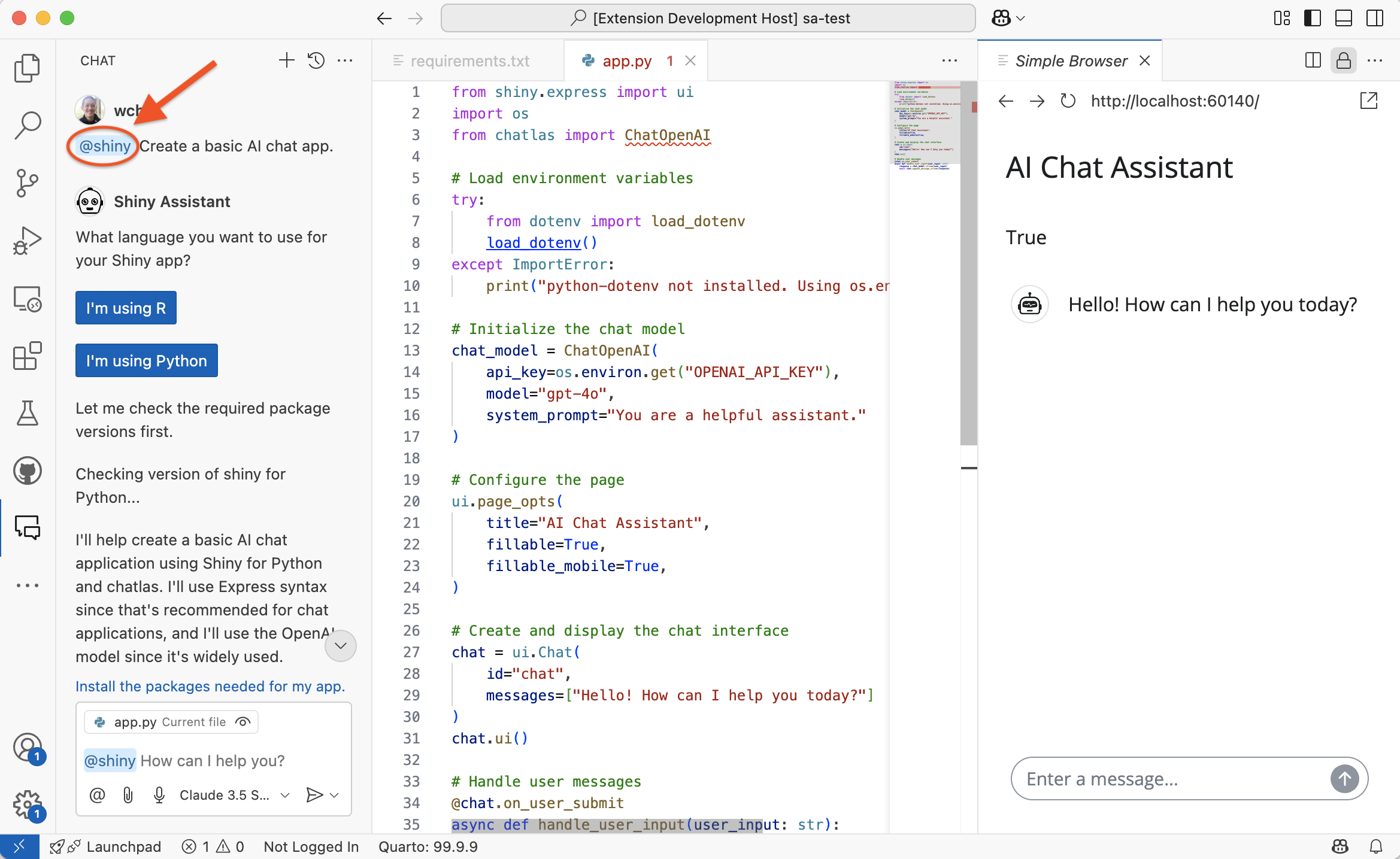 live_browser(client) to open a browser-based chat clientsystem_prompt and see how it affects the outputrole (“system”, “user”, “assistant”) and a content string{shinychat} package